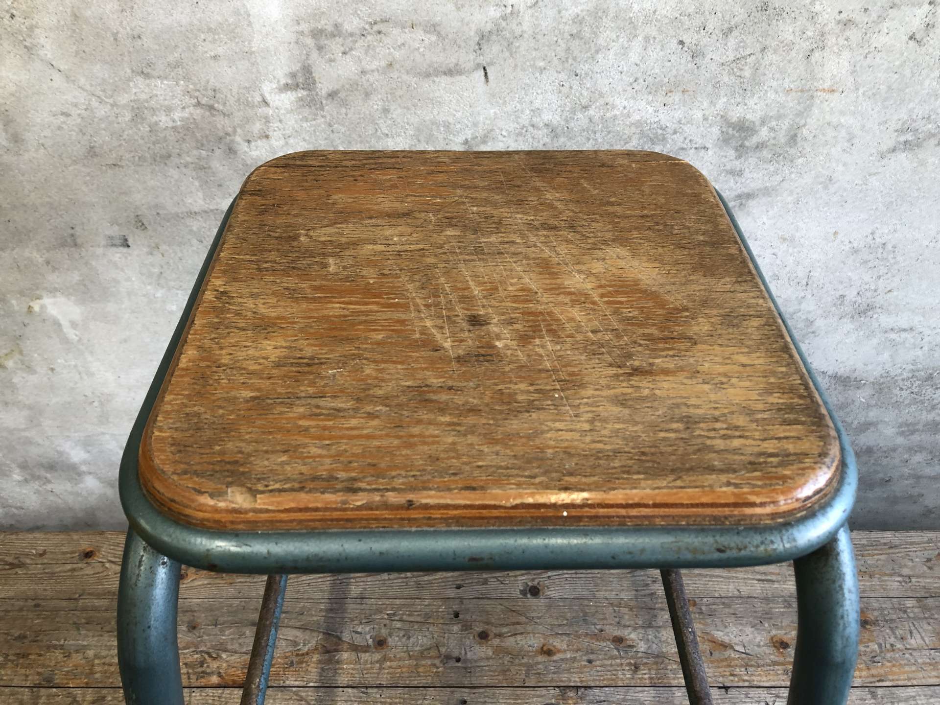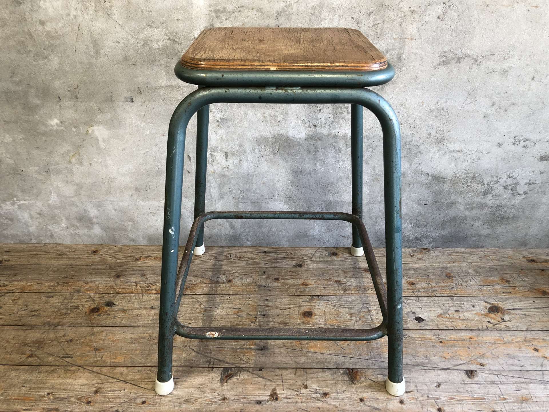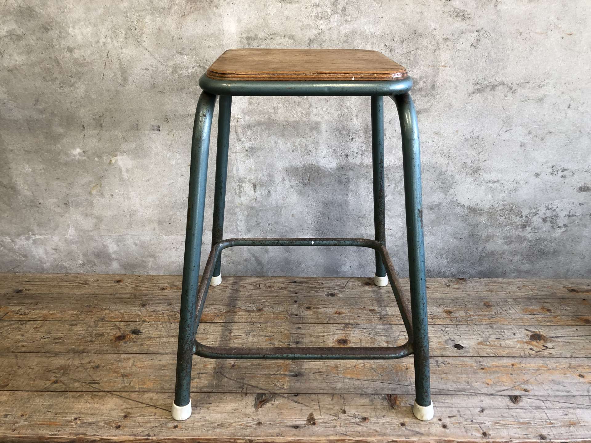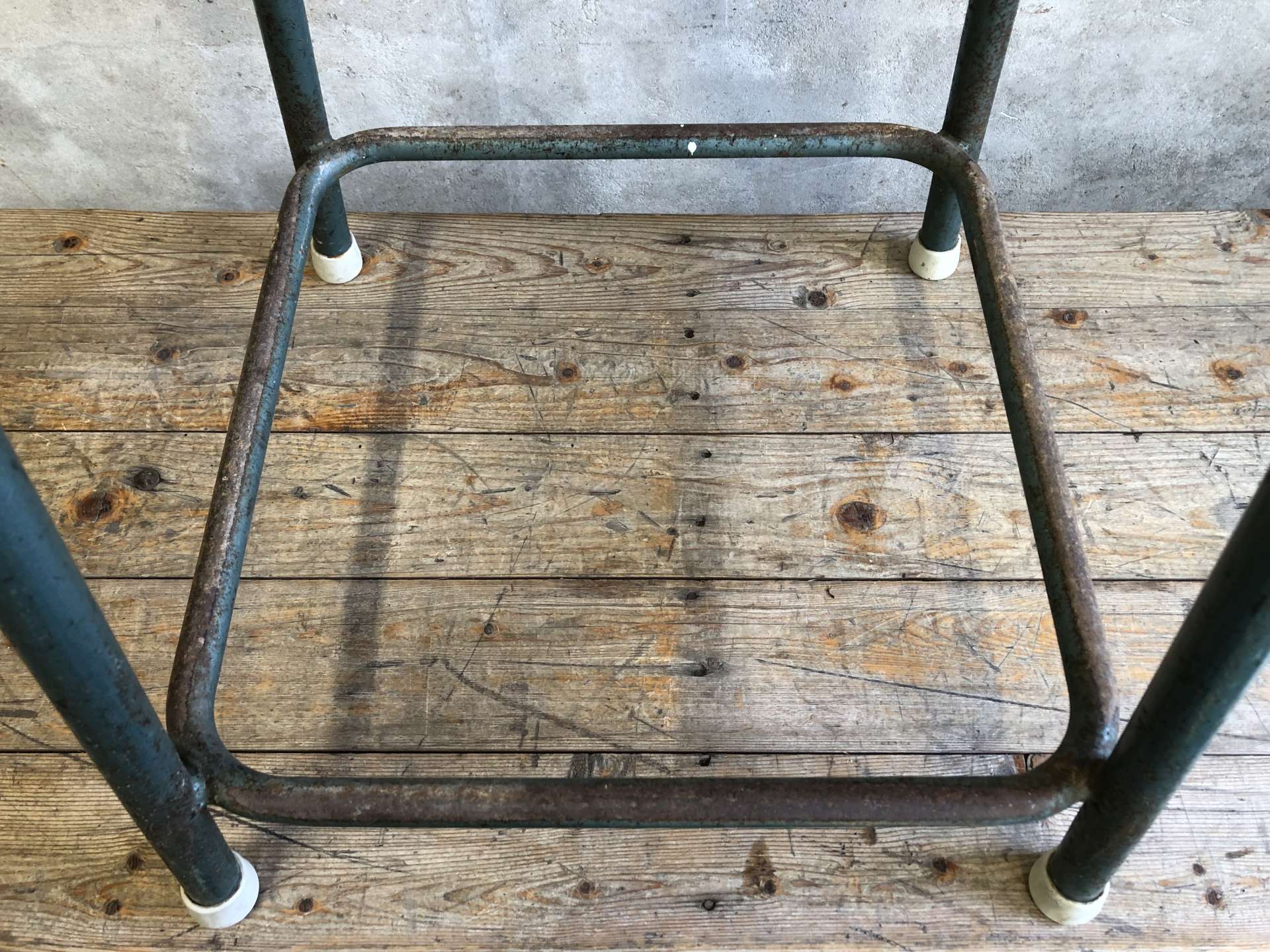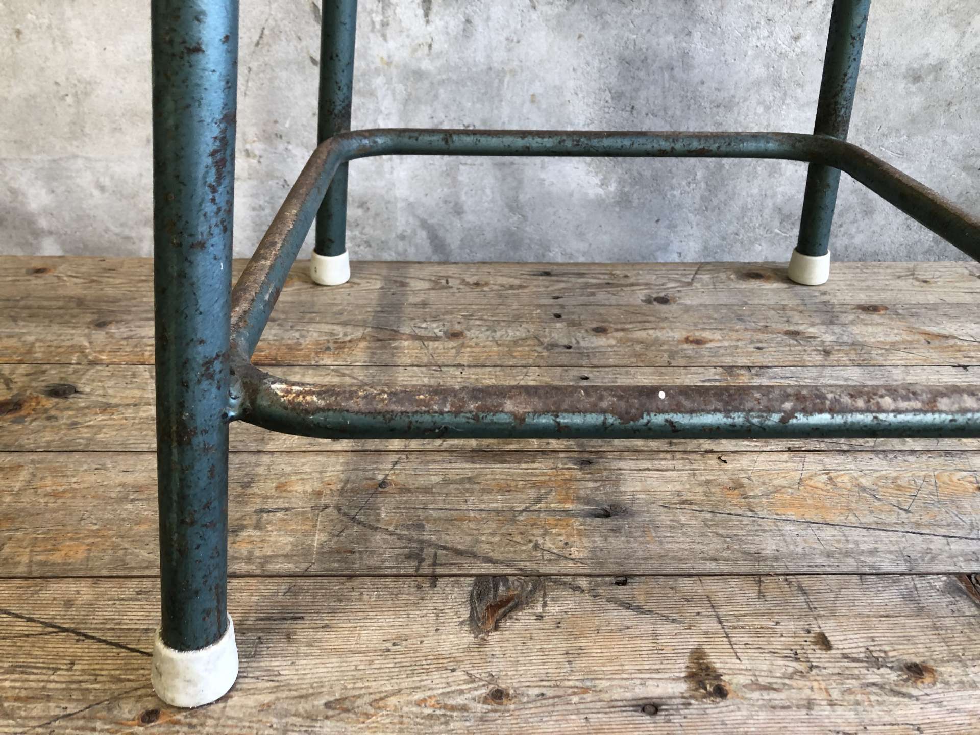 Stoere vintage kruk met groen stalen frame en houten zitting afkomstig uit Frankrijk.