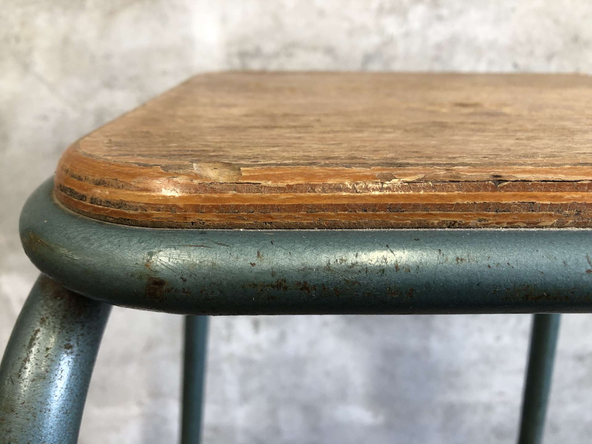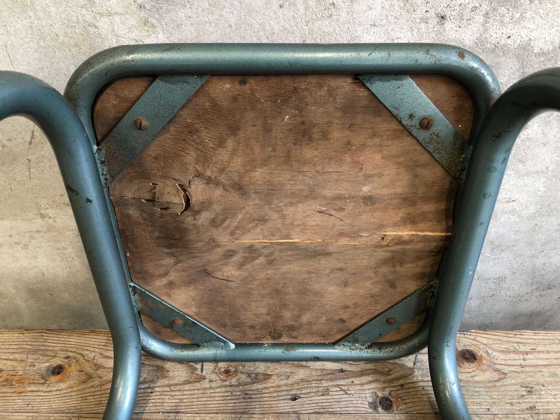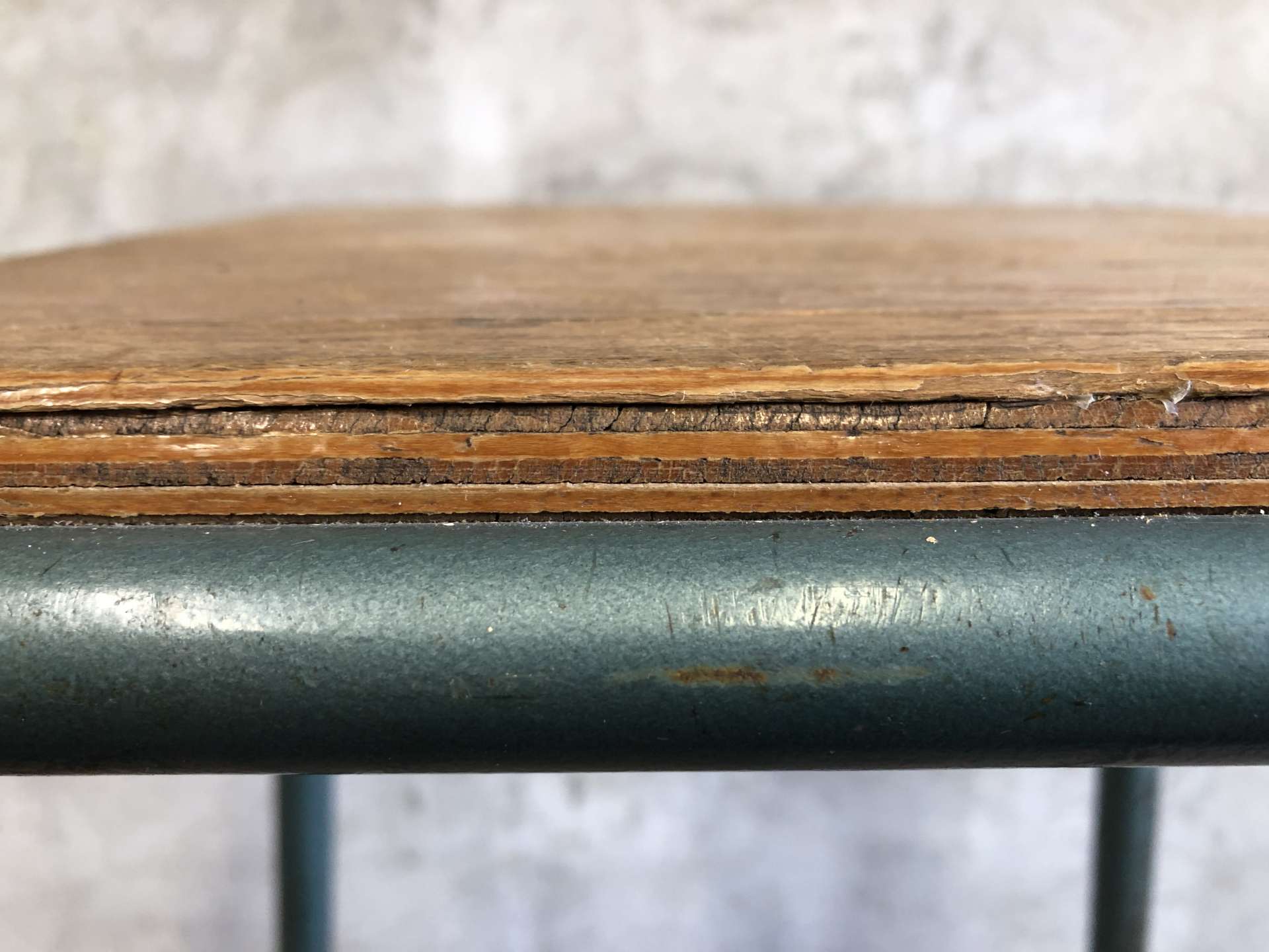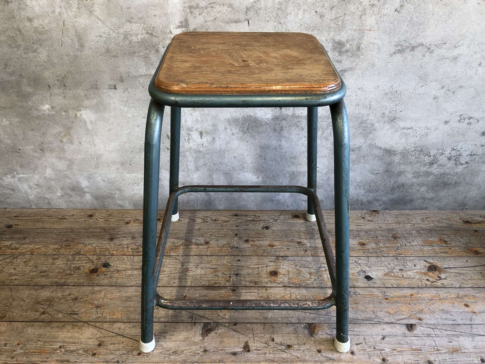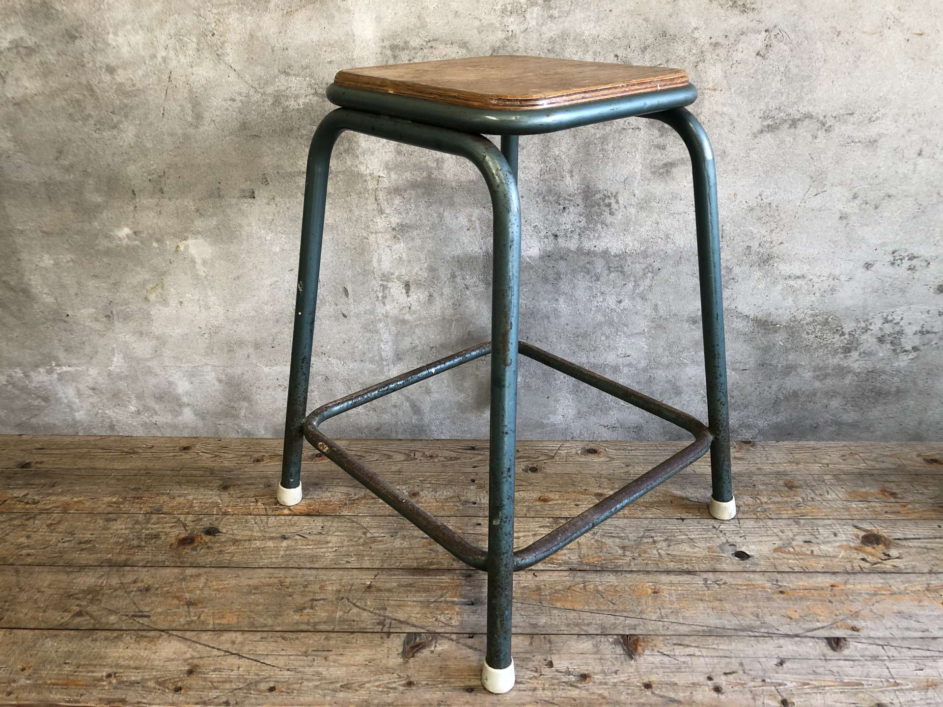 Stoere vintage kruk met groen stalen frame en houten zitting afkomstig uit Frankrijk.