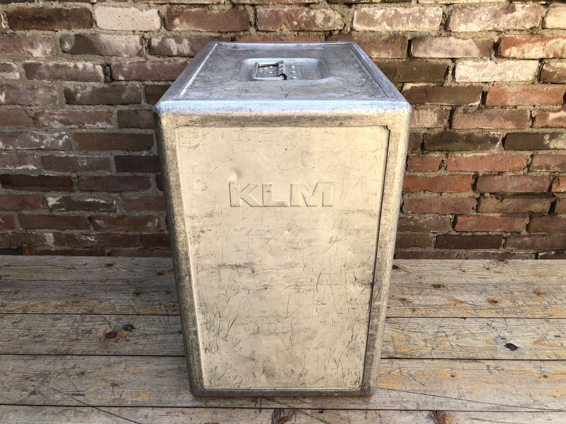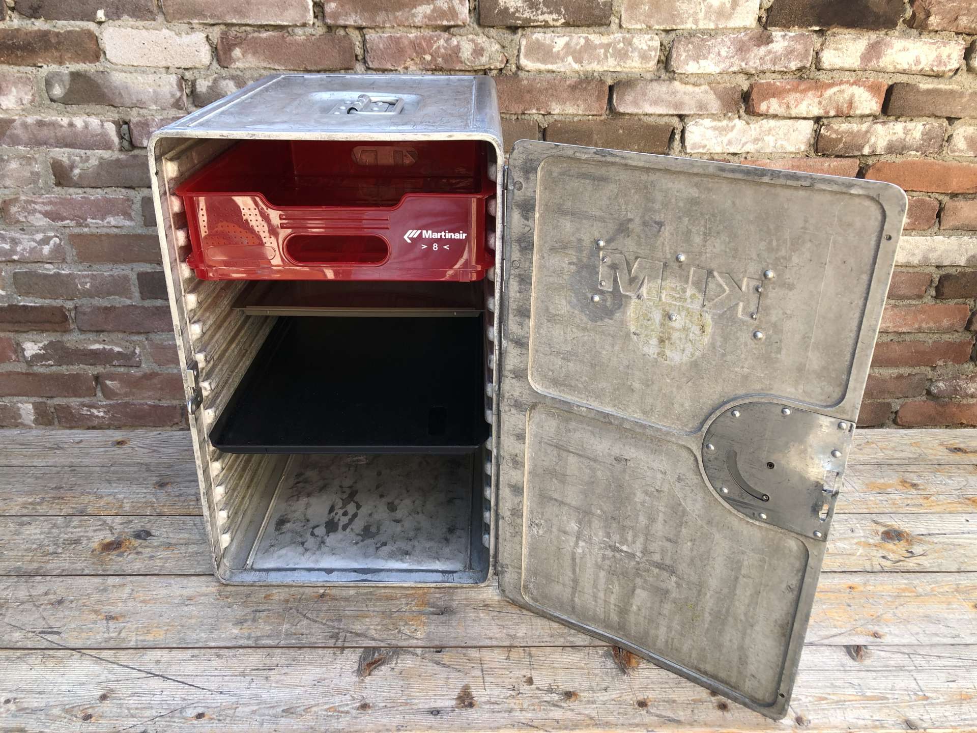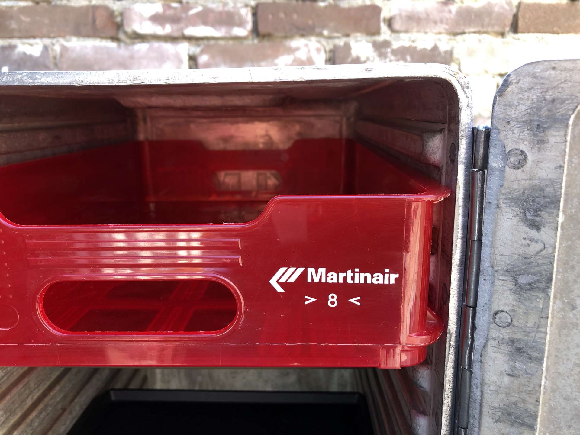 In het kastje zit 1 lade van Martinair en een zwart dienblad van KLM.