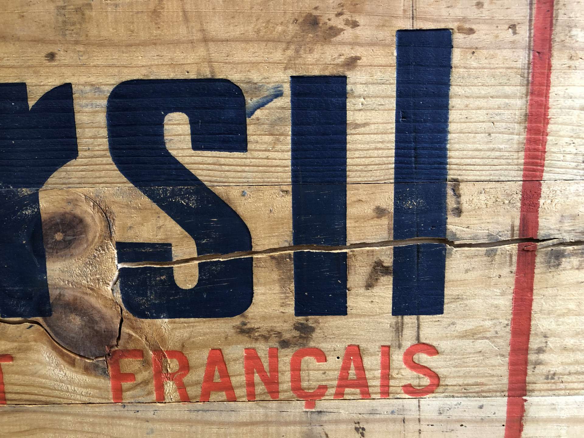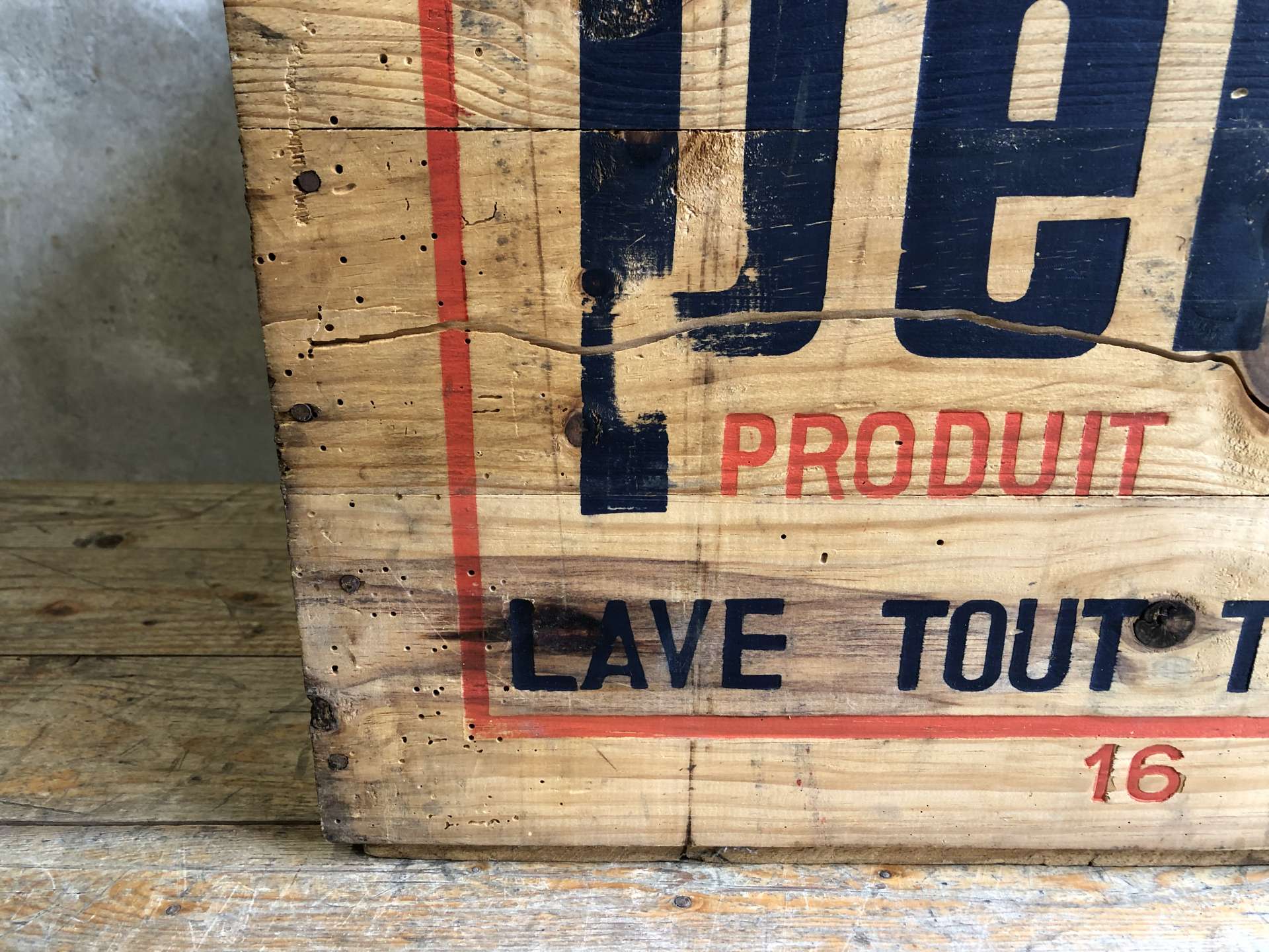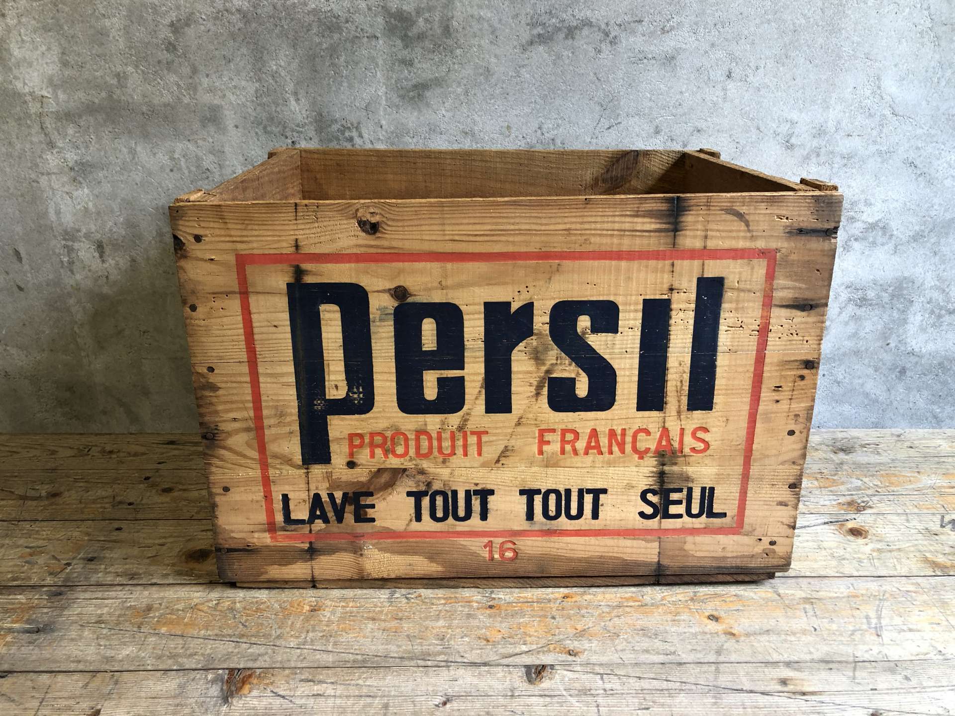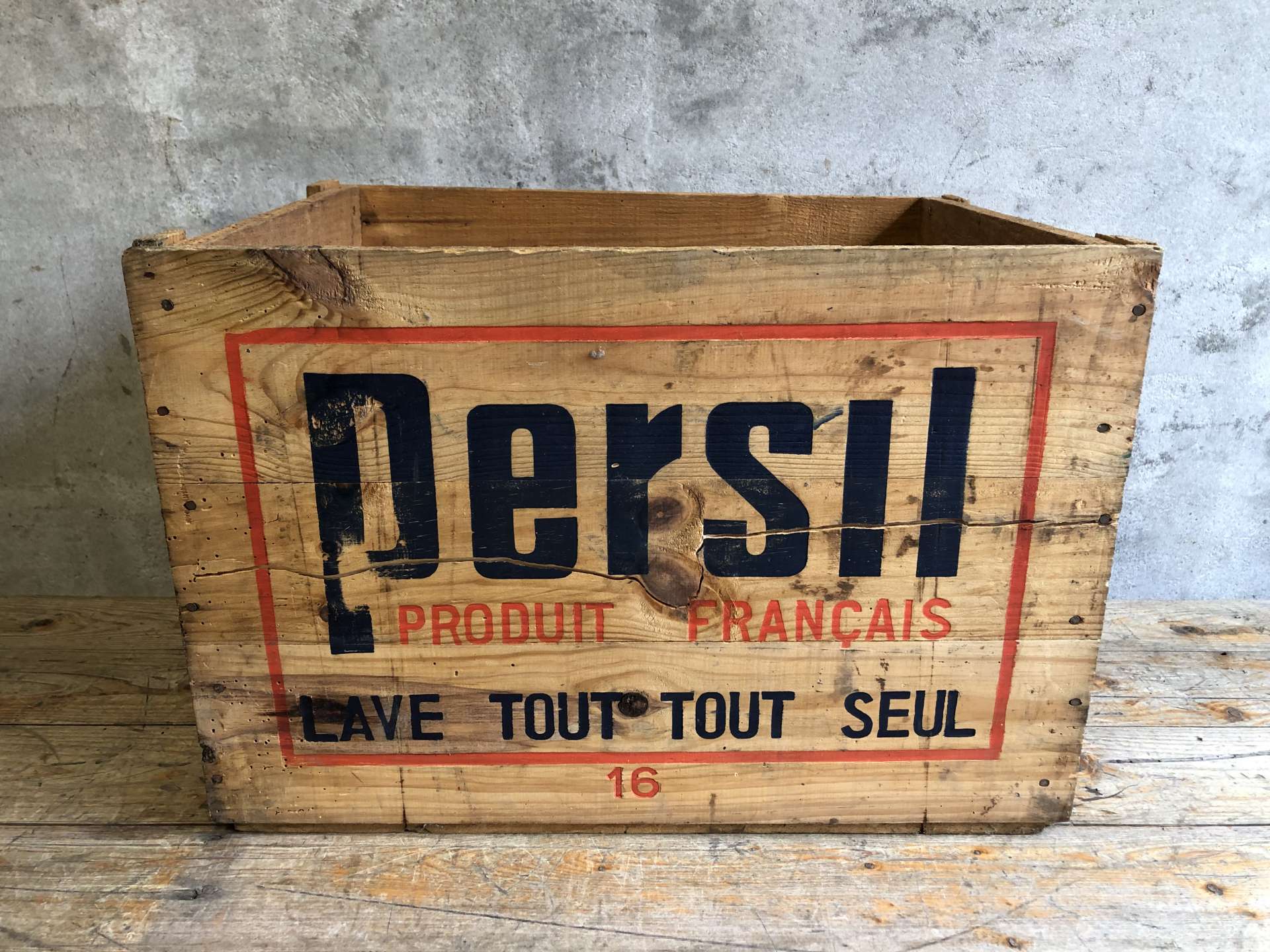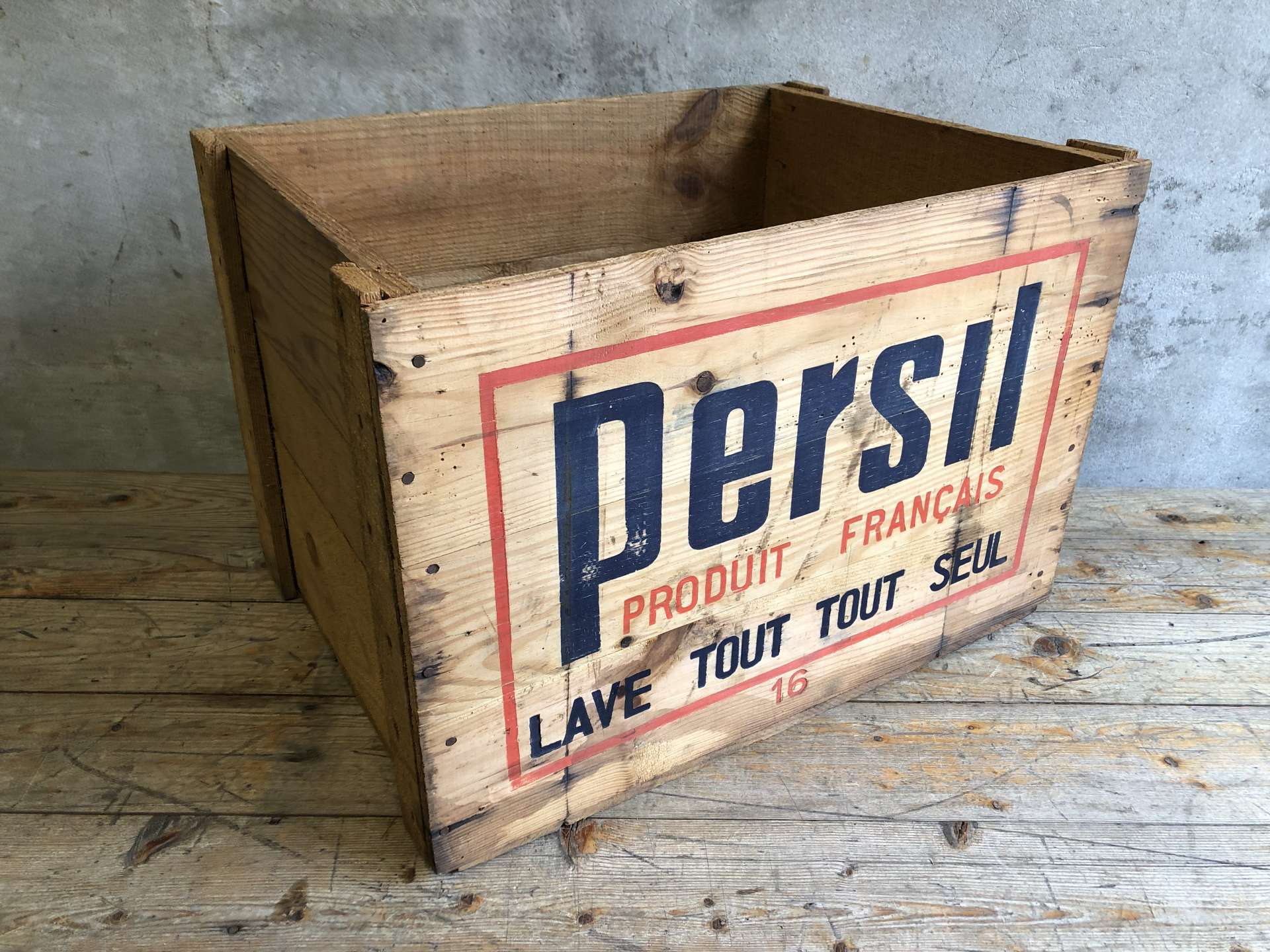Vintage houten kist van het merk Persil afkomstig uit Frankrijk.