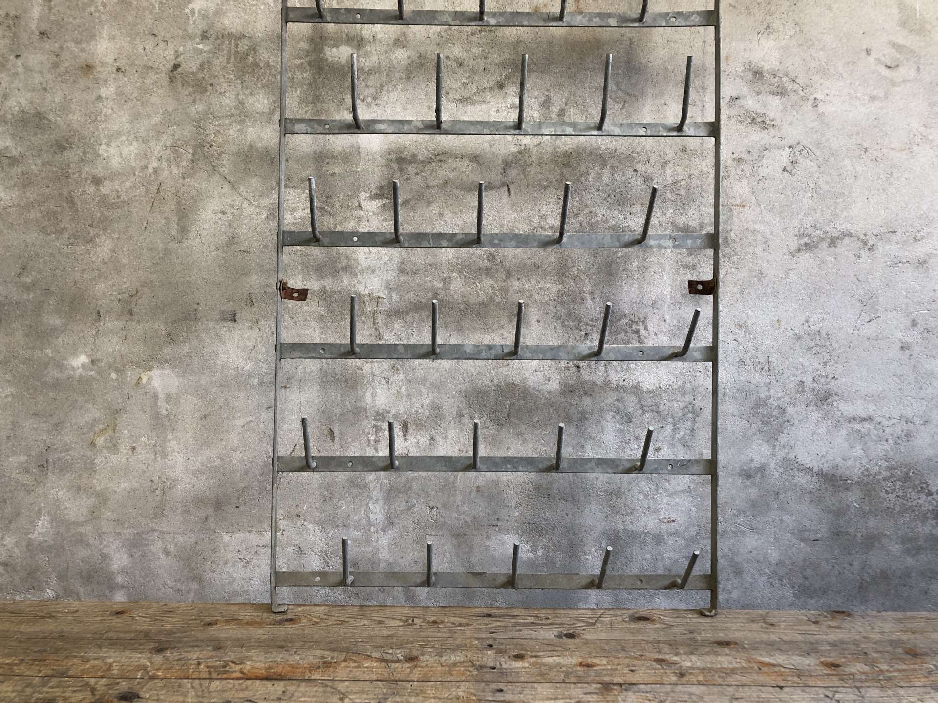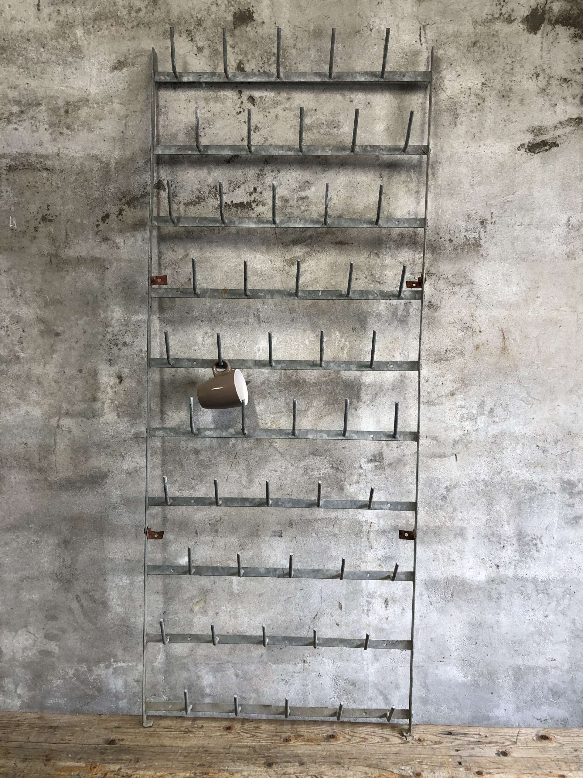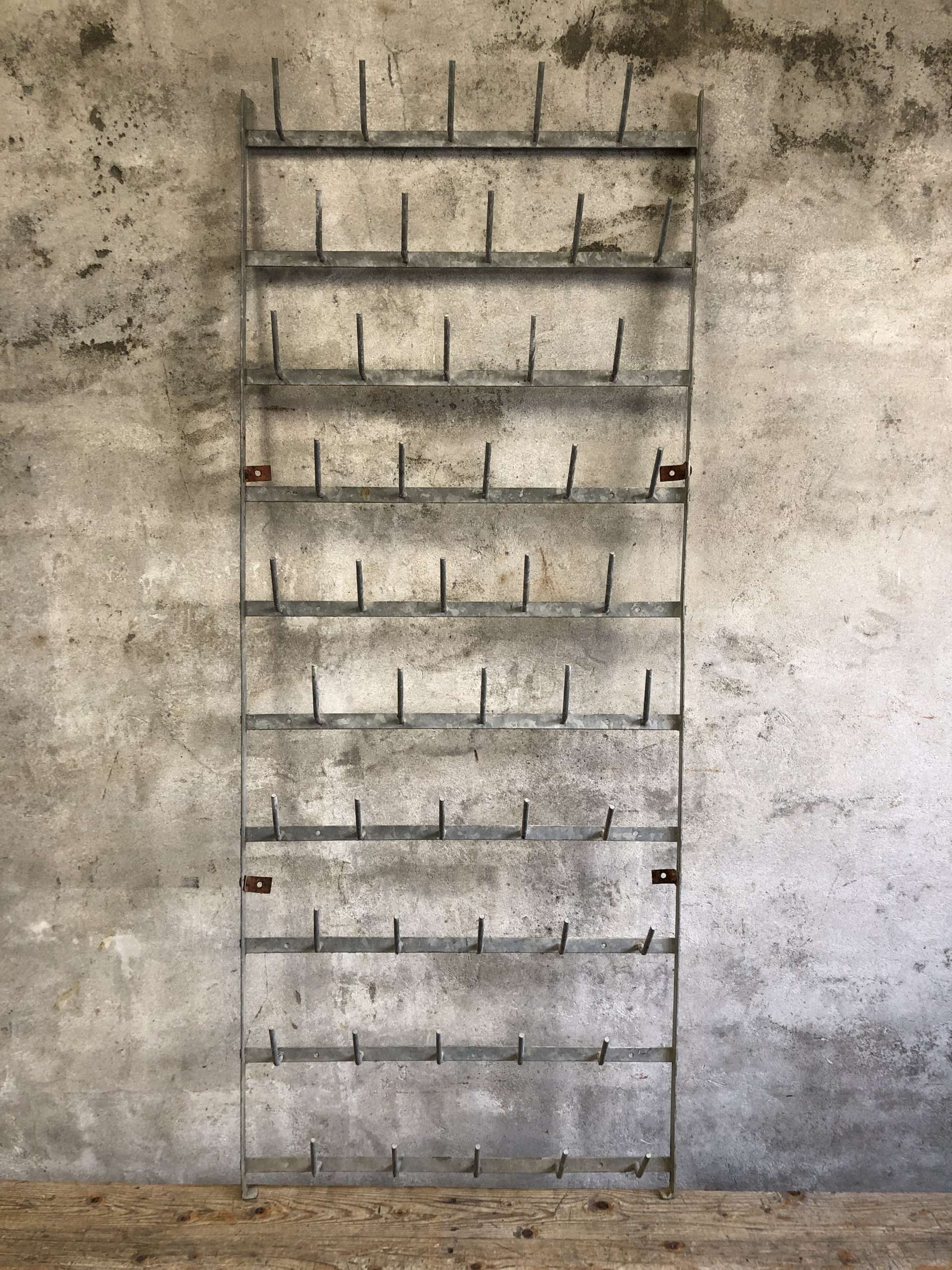 Zinken flessenrek uit Frankrijk voor aan de wand met 50 haken.