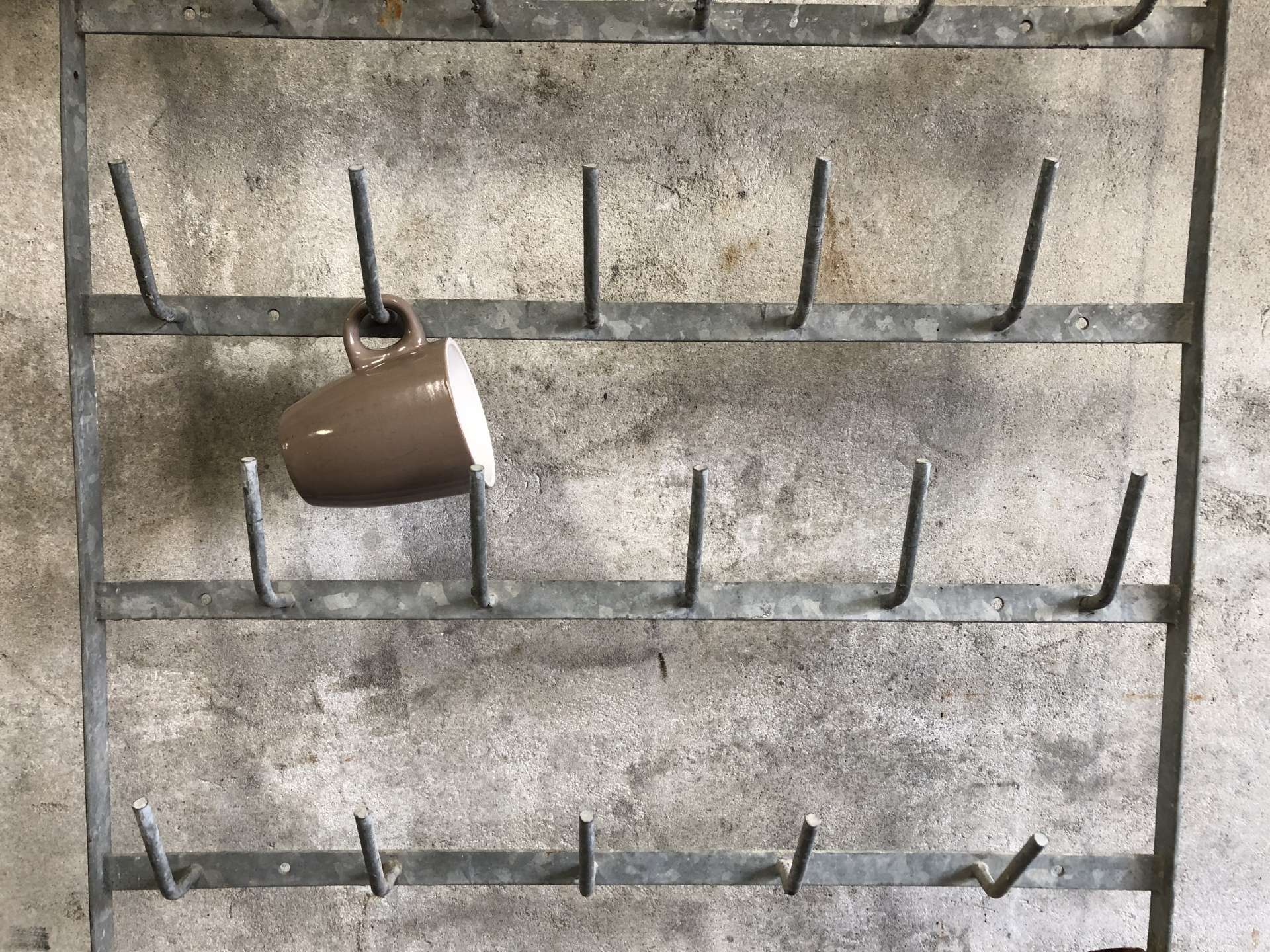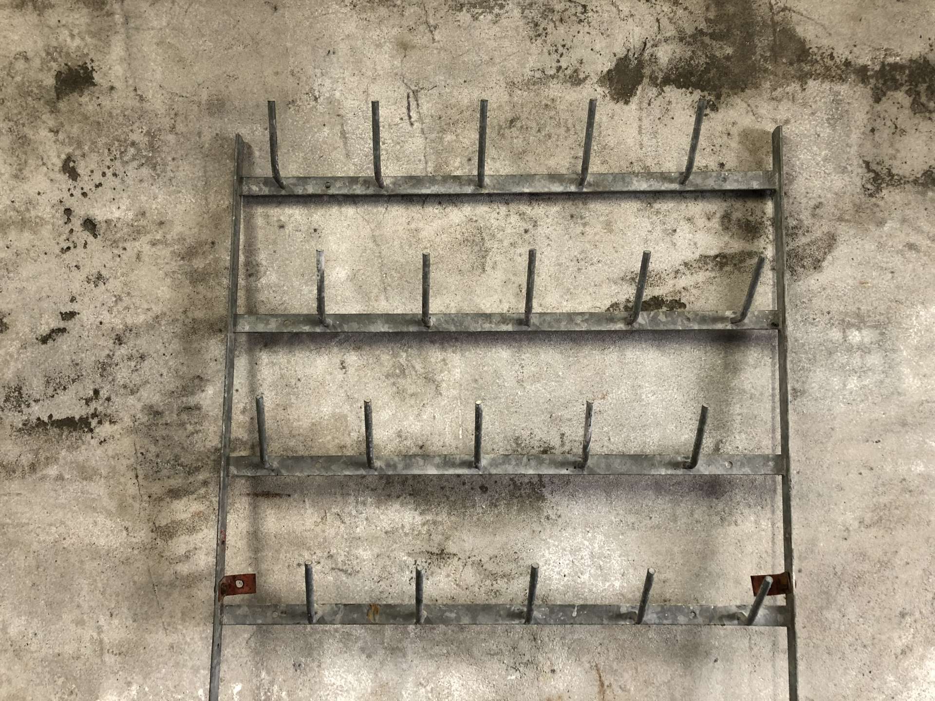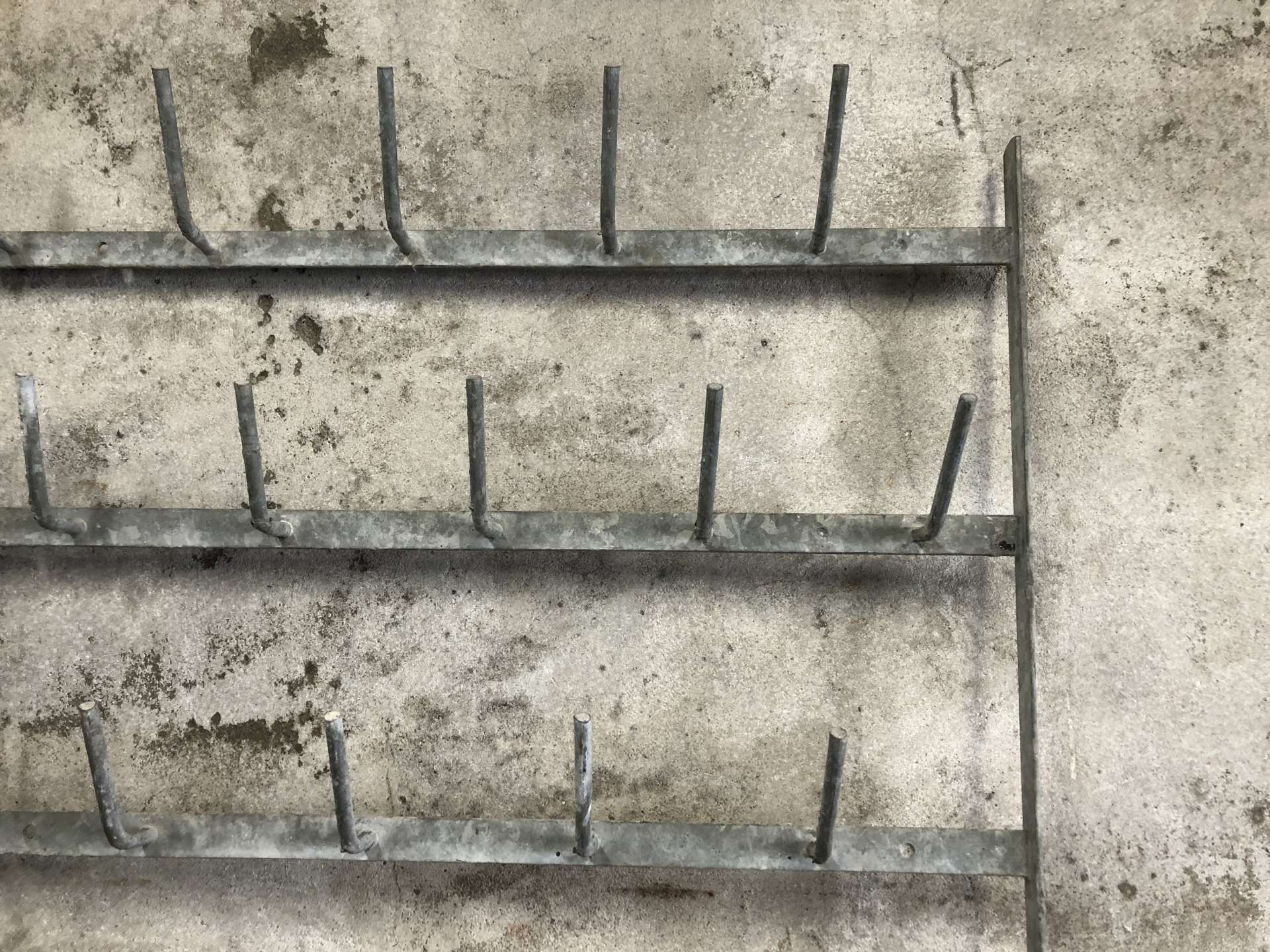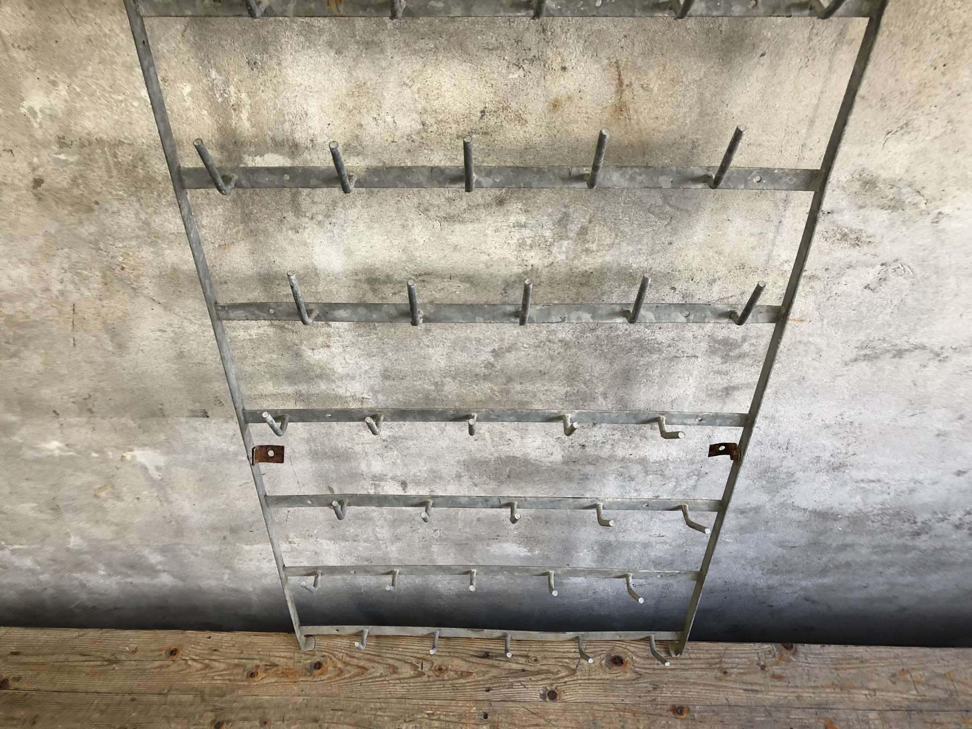Zinken flessenrek uit Frankrijk voor aan de wand met 50 haken.