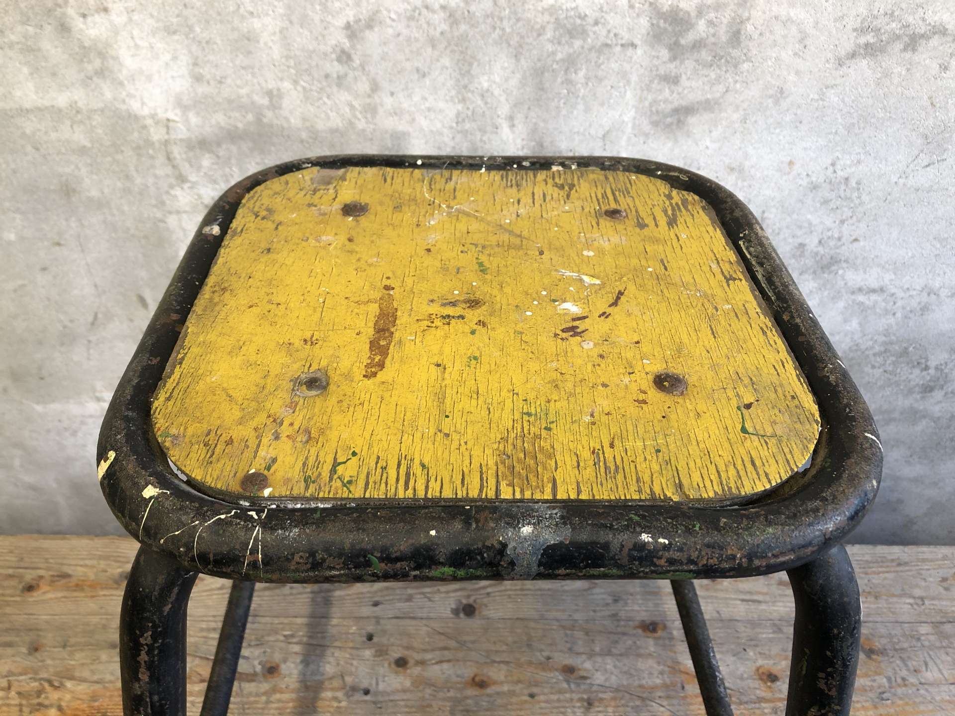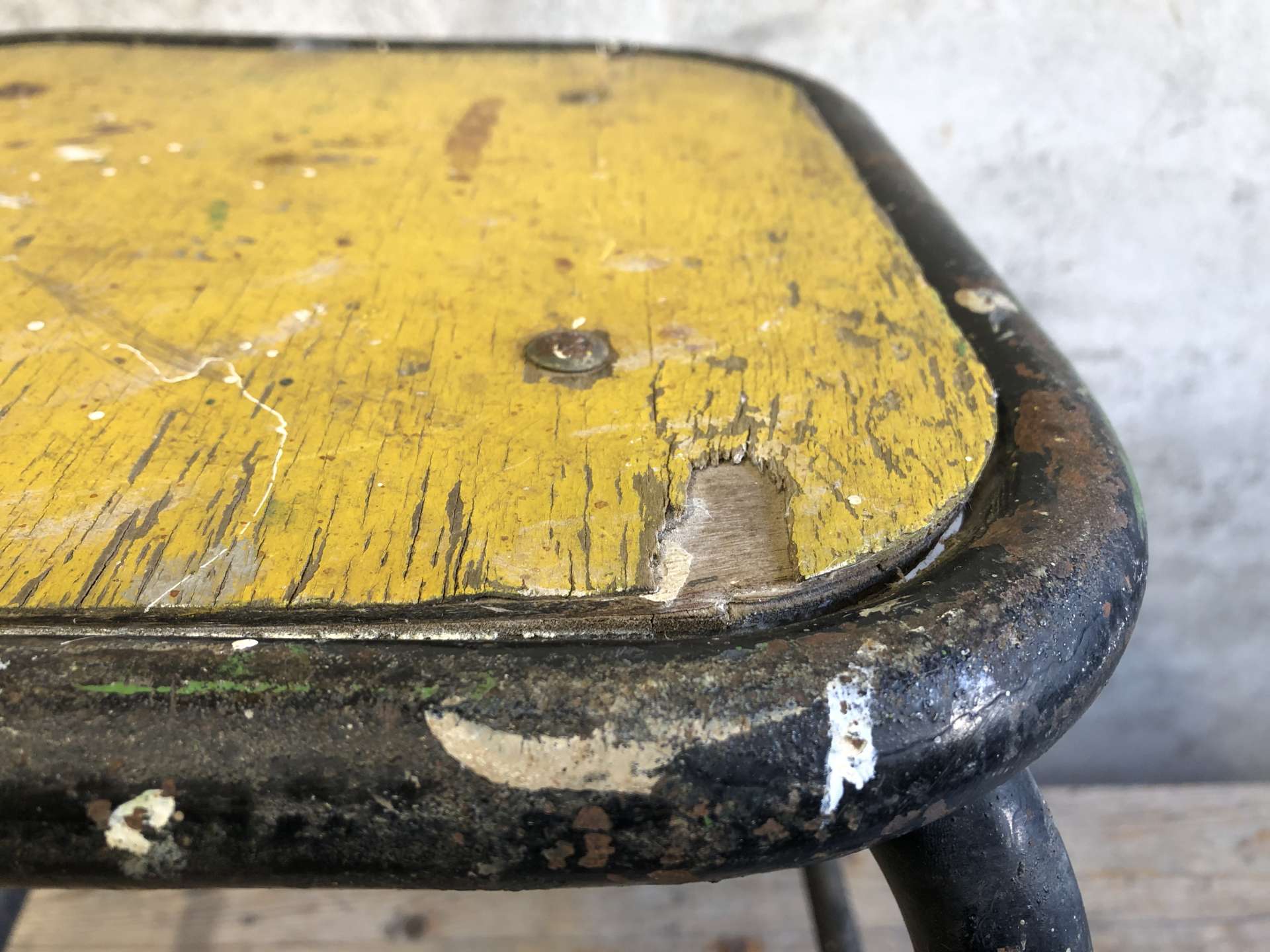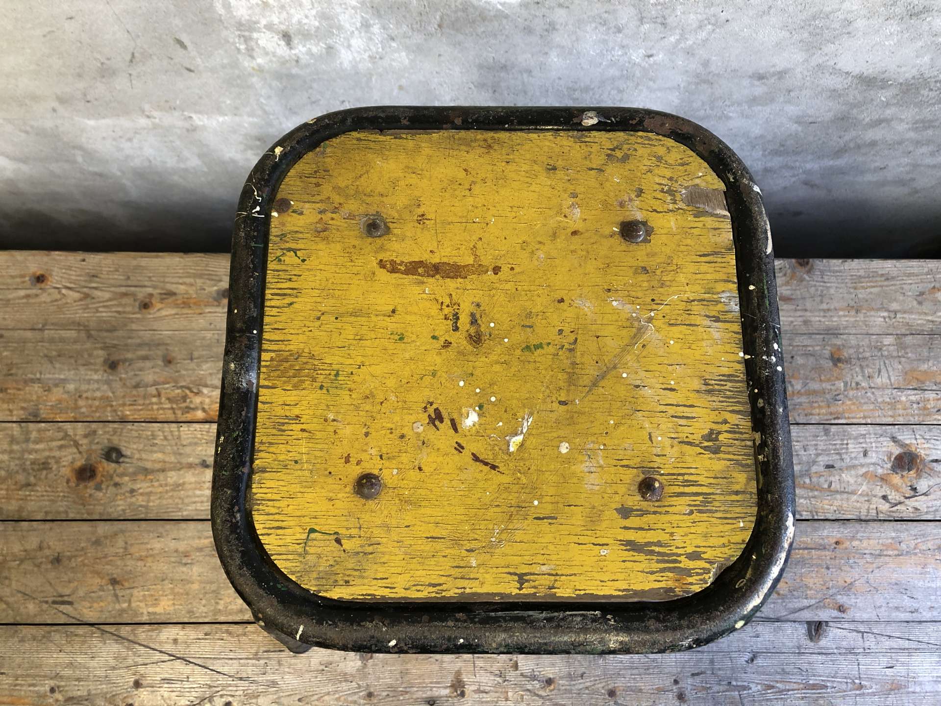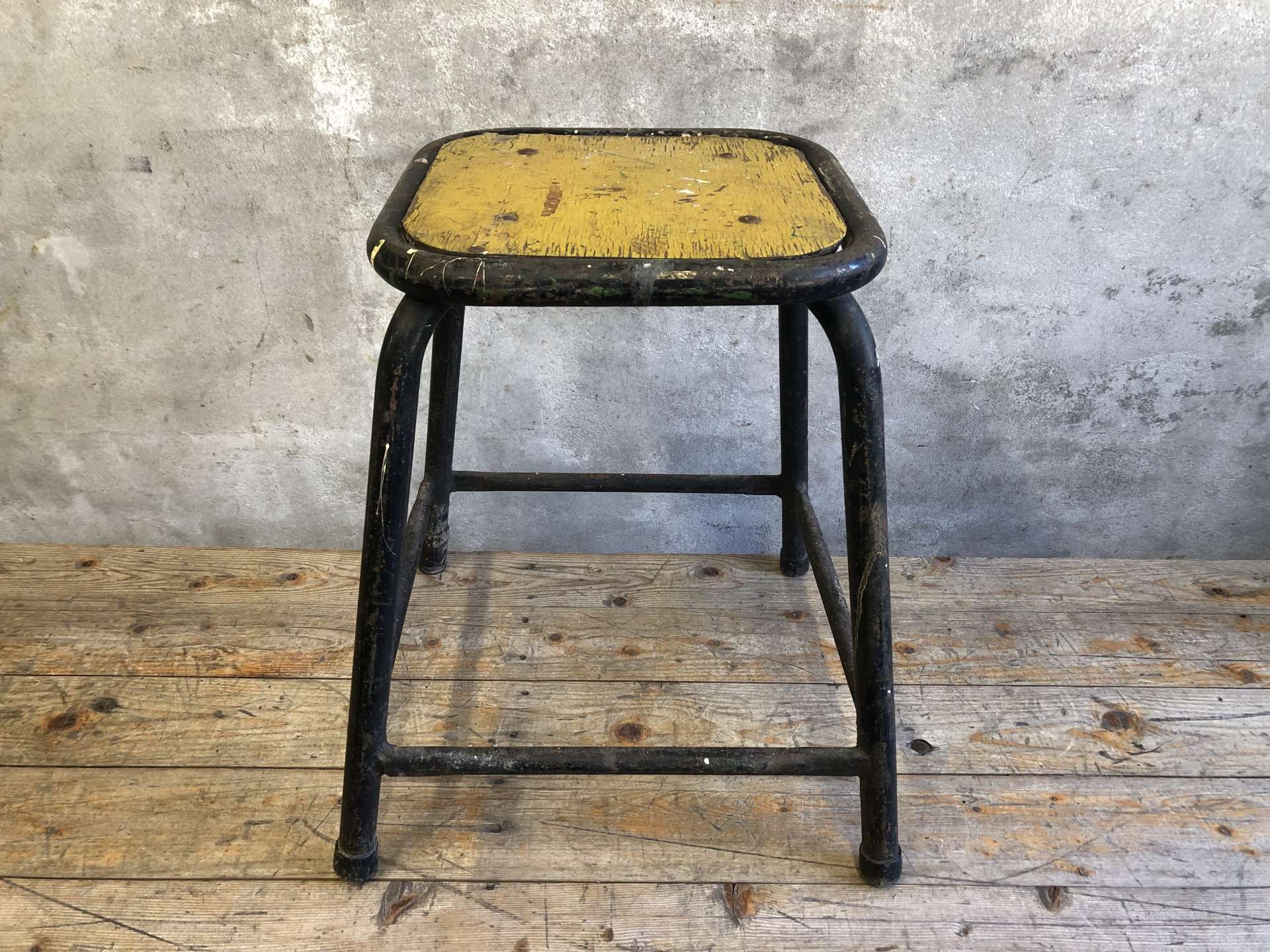 Vintage krukje / tafeltje / plantentafel met zwart stalen frame en okergeel houten zitting.