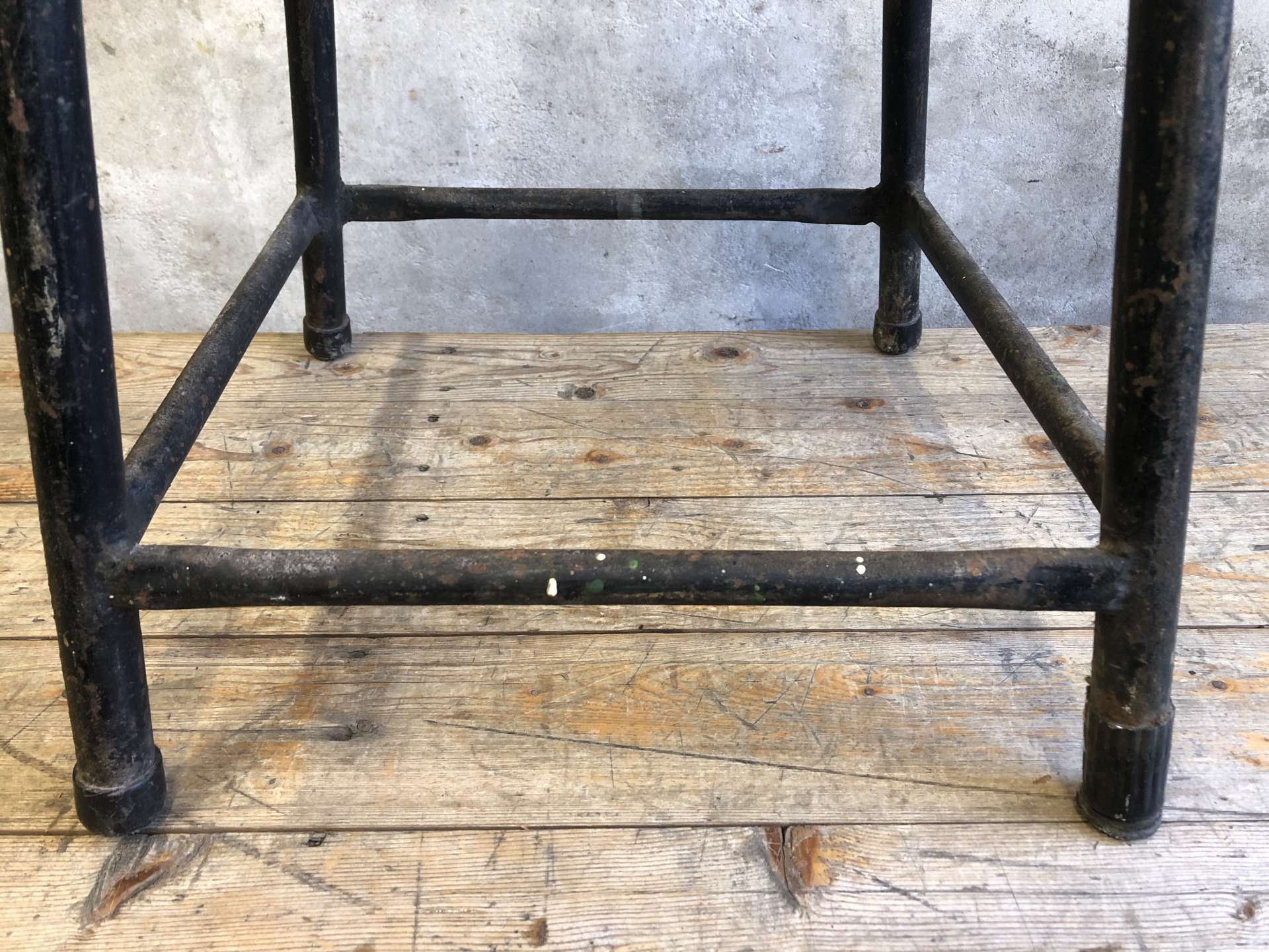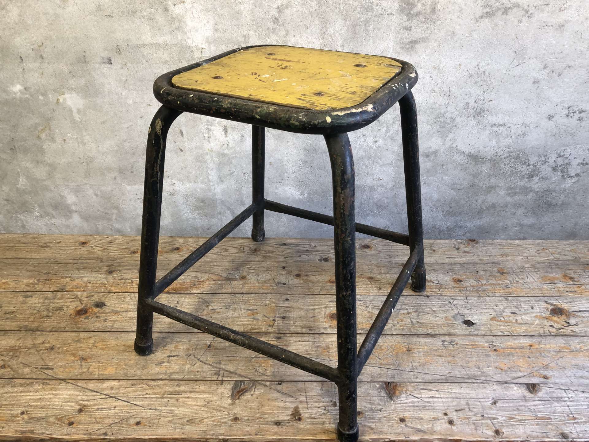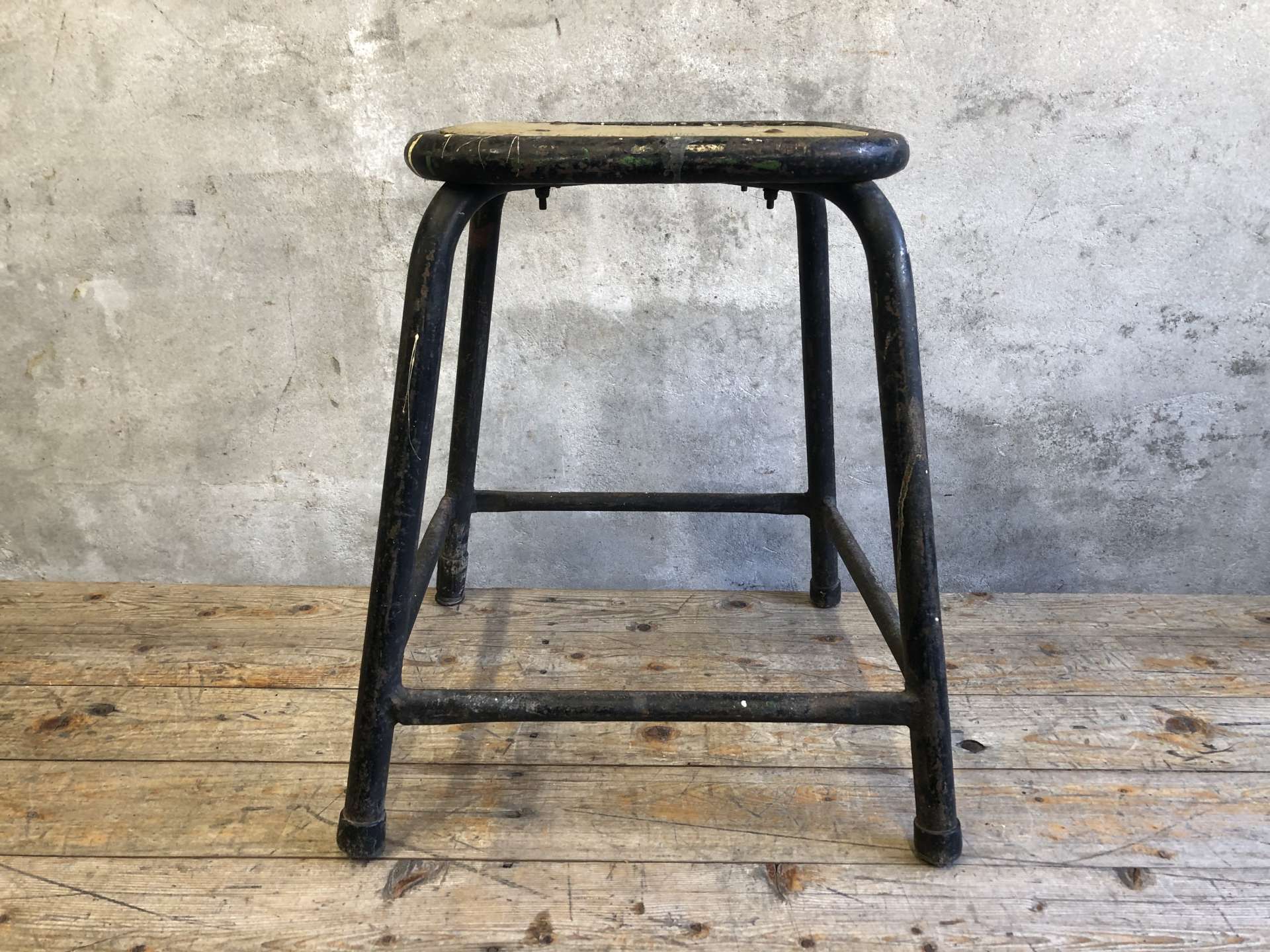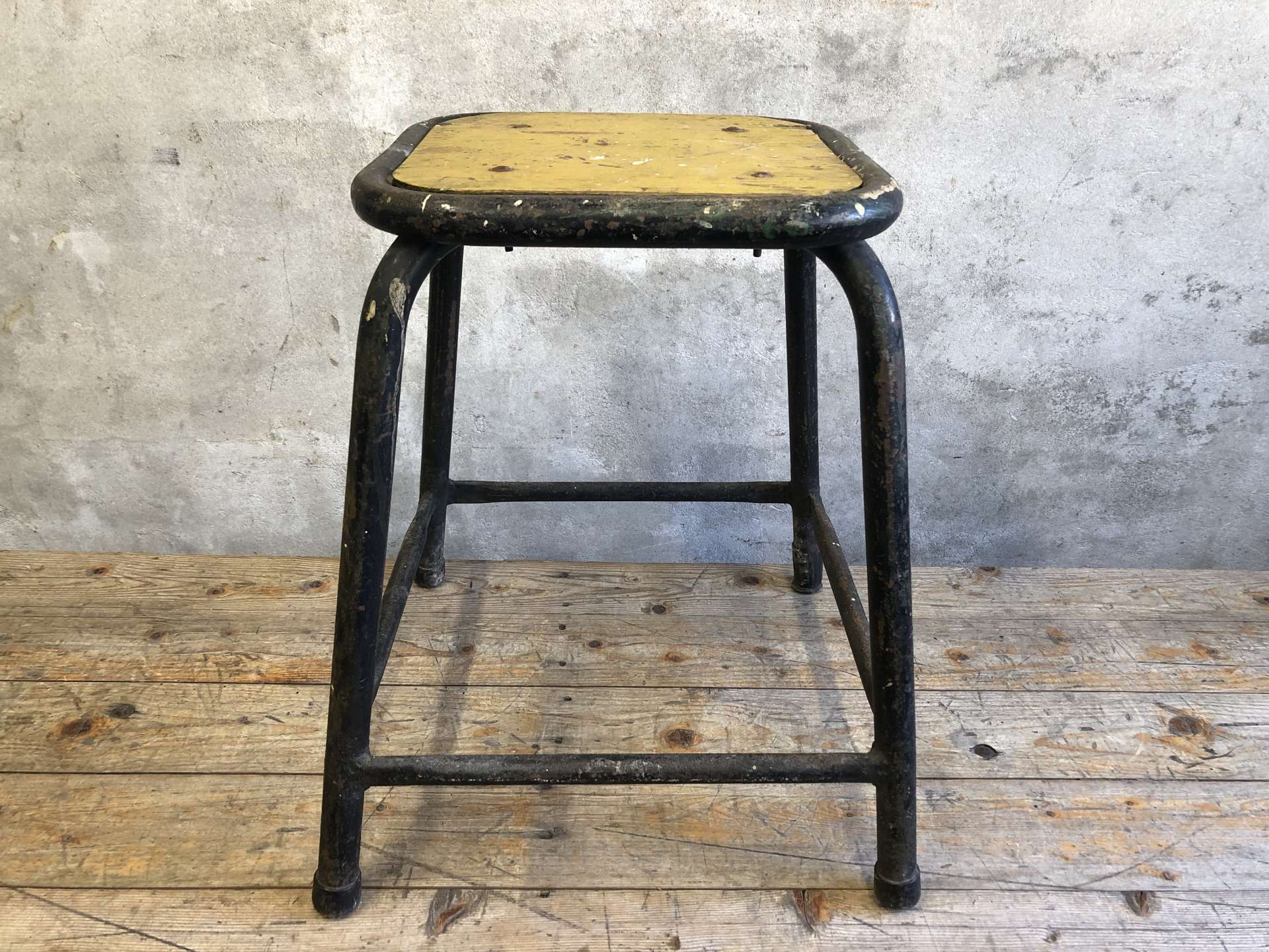 Vintage krukje / tafeltje / plantentafel met zwart stalen frame en okergeel houten zitting.