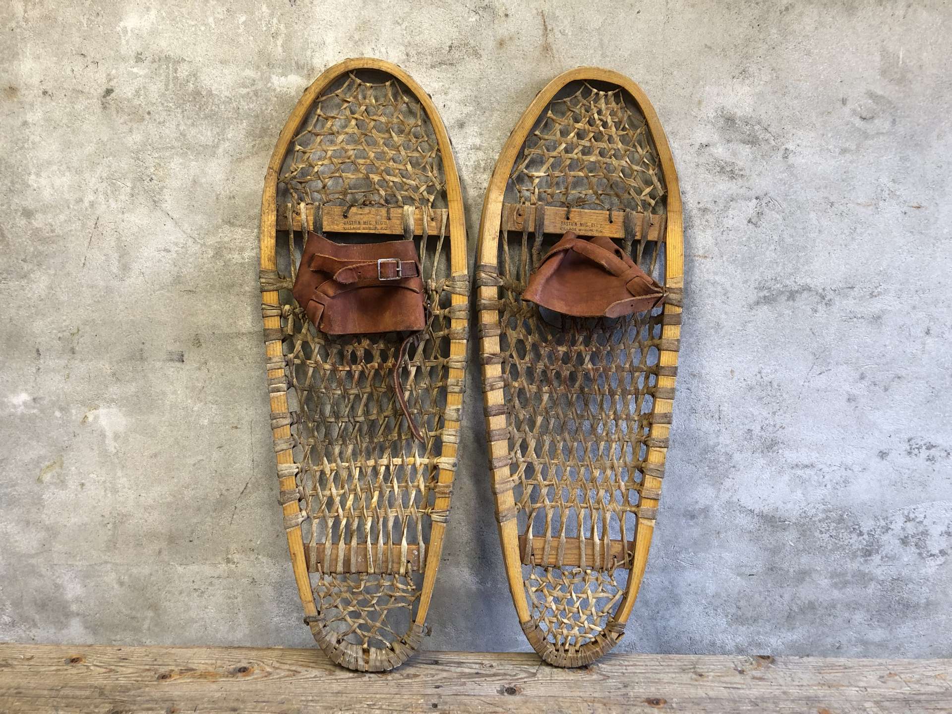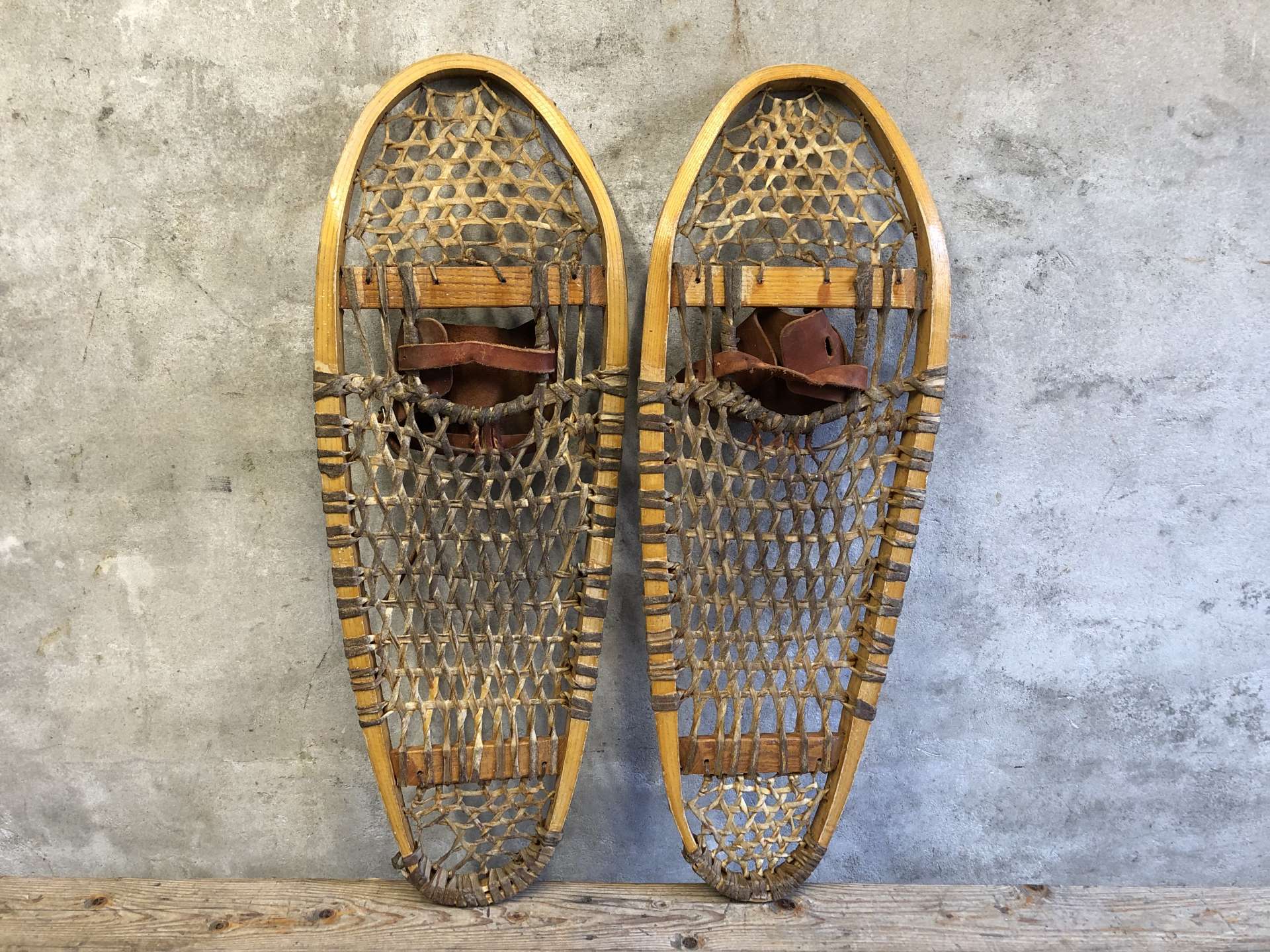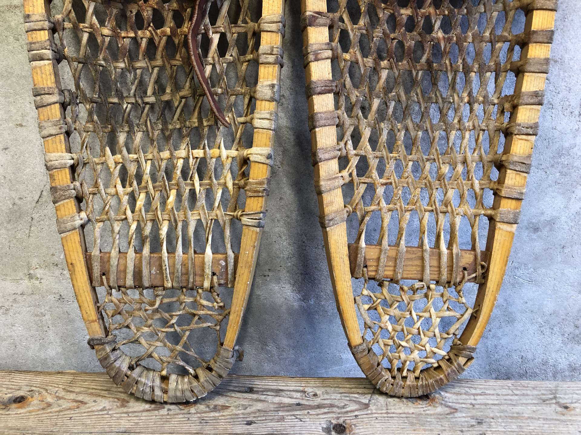 Set vintage sneeuwschoenen van hout en met lederen riempjes afkomstig uit Canada.