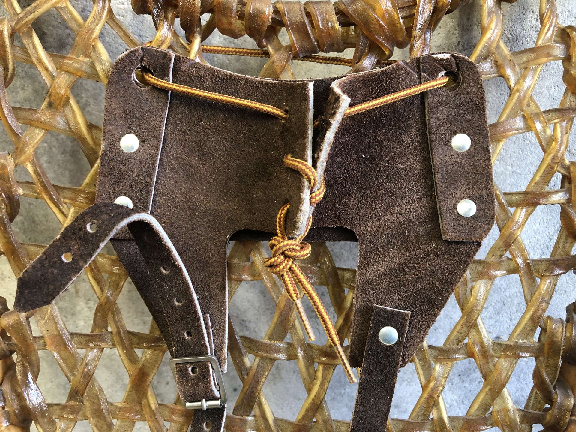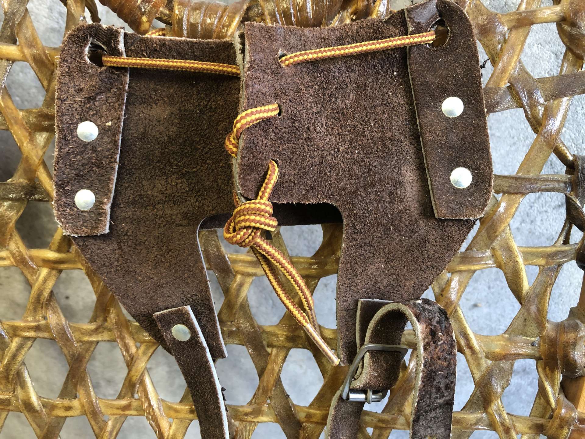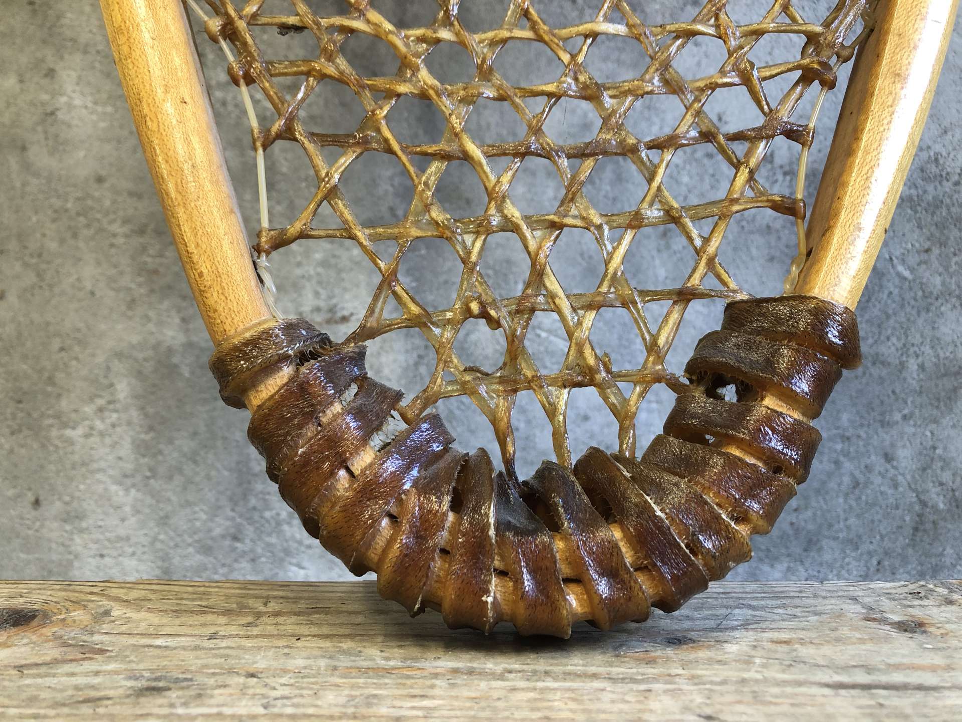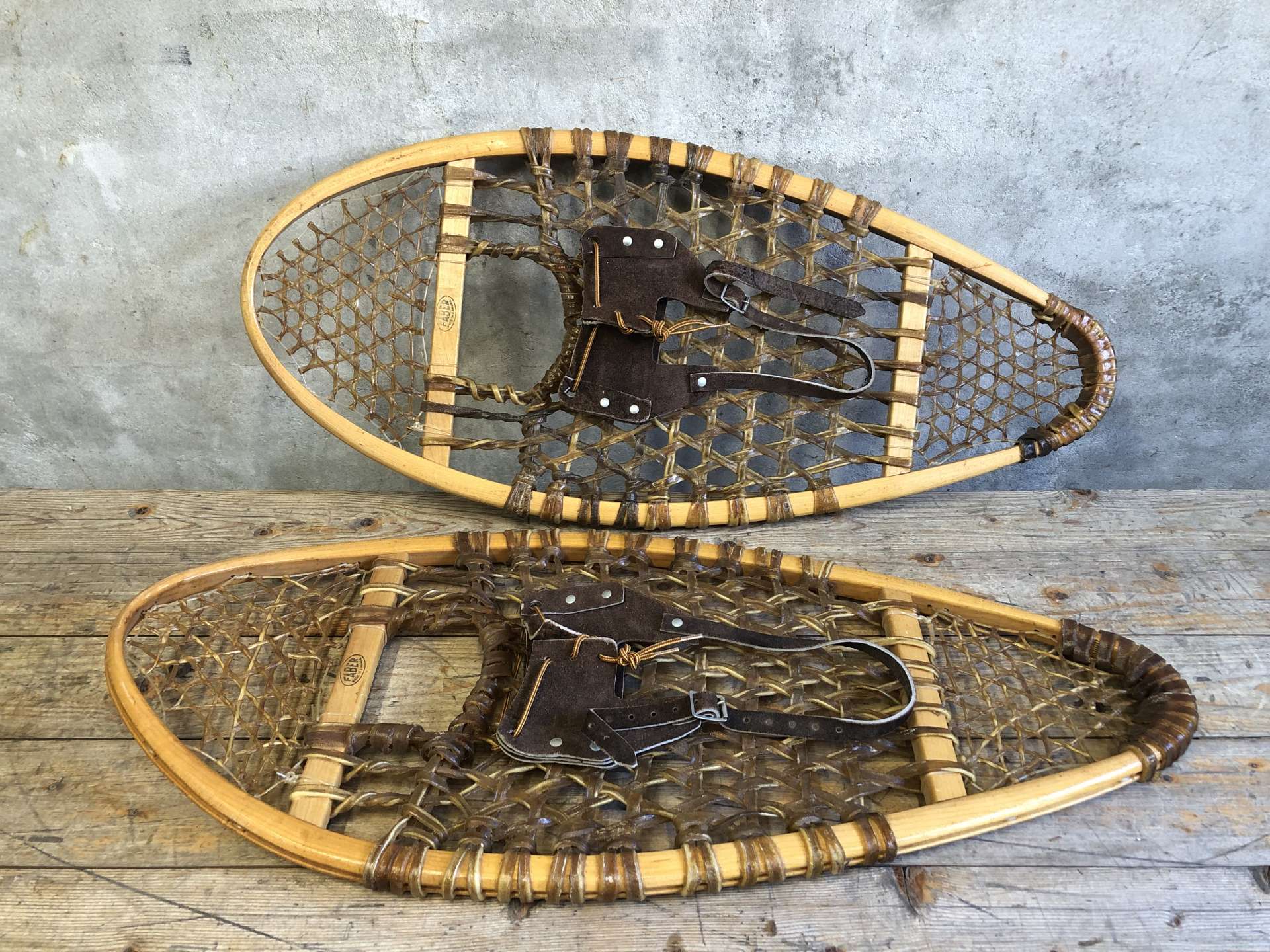 Mooie set vintage sneeuwschoenen van hout en met lederen riempjes afkomstig uit Canada.