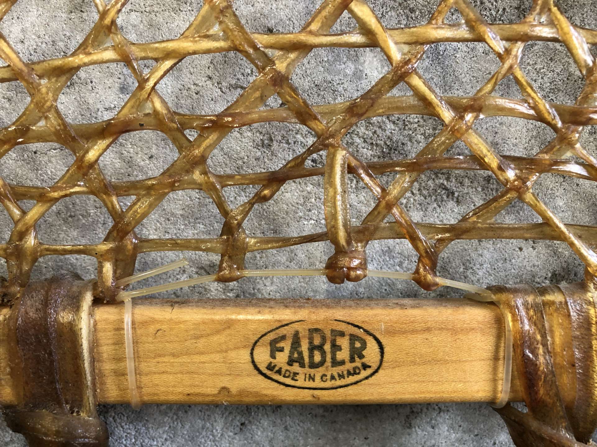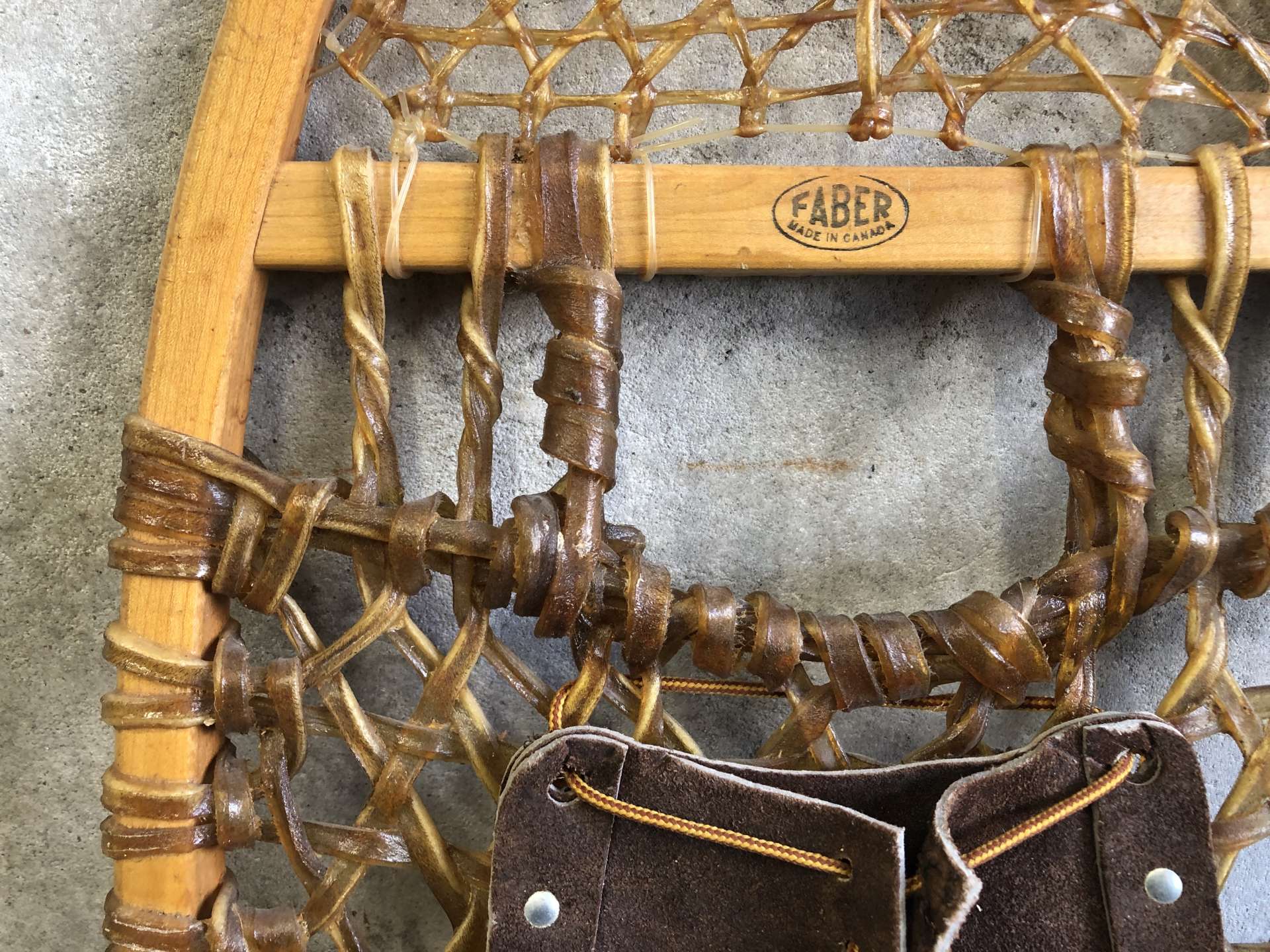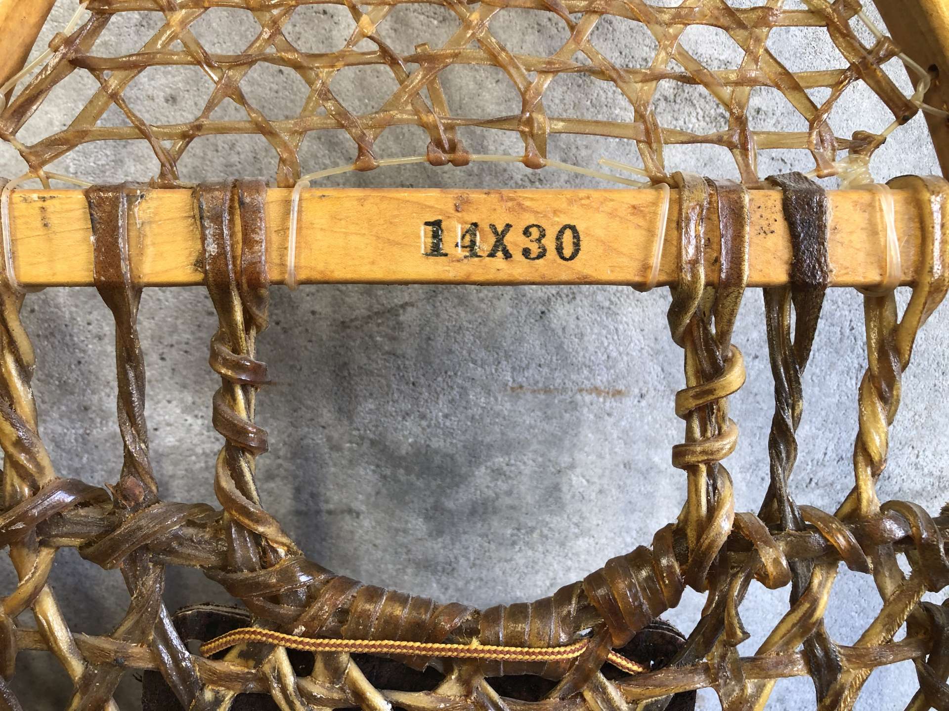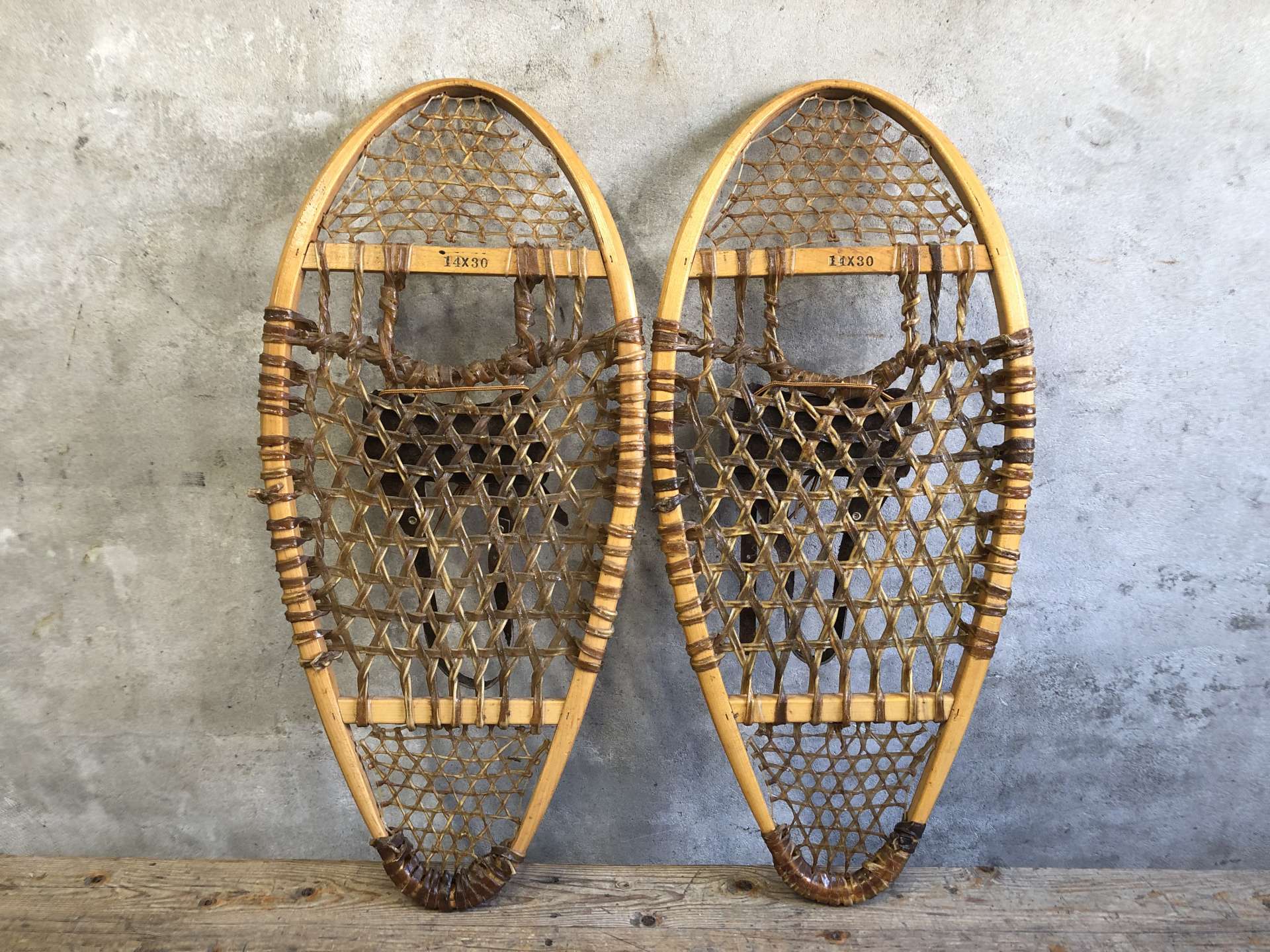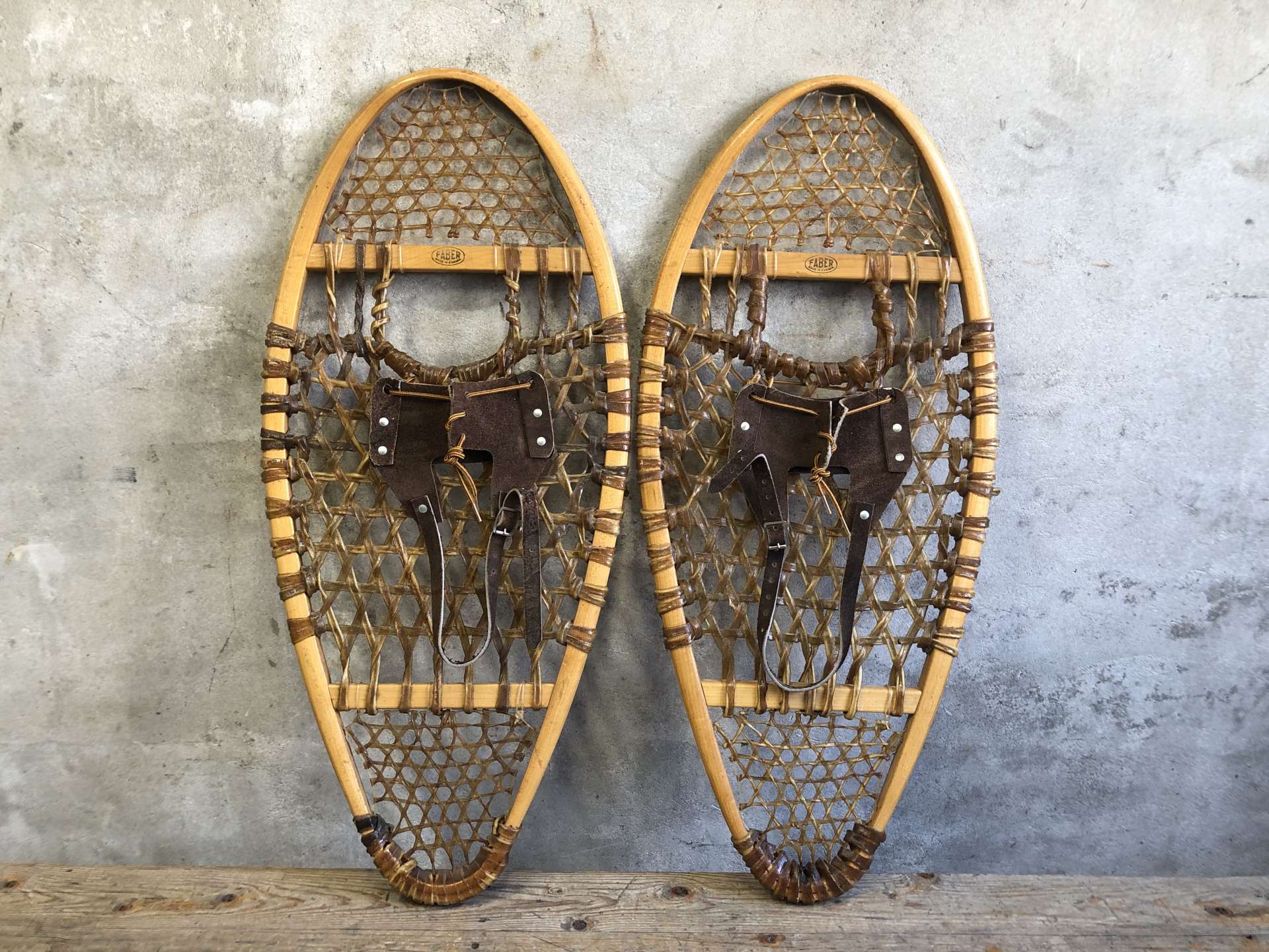 Mooie set vintage sneeuwschoenen van hout en met lederen riempjes afkomstig uit Canada.